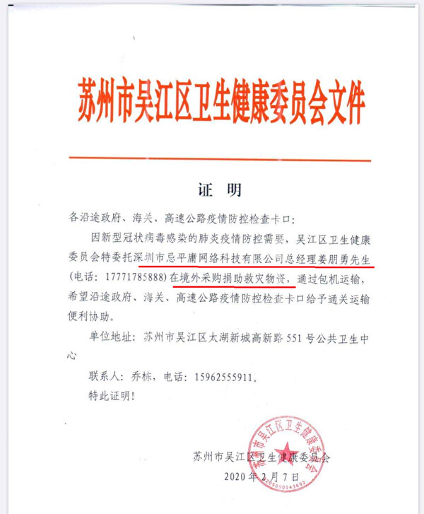 他的生意夥伴黃某,不但提供了「蘇州市吳江區衛生健康委員會」和「杭州市江干區疾病預防控制中心」等政府部門開給黃某的防疫品採購證明;甚至如他所願,給他出具了、專門開給姜朋勇的政府採購證明(紅頭文件)。