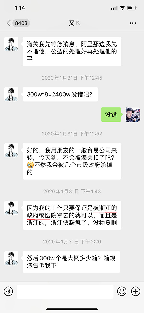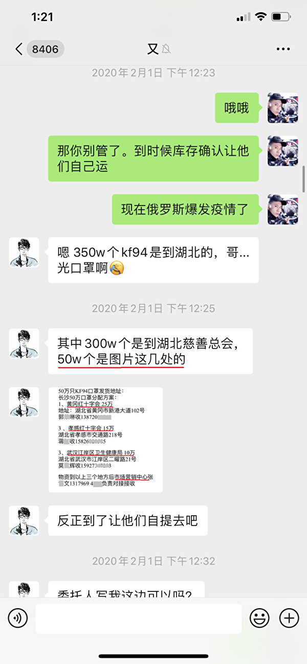 姜提供的聊天記錄顯示,今年2月1日,黃某告訴姜,委託訂購的350萬隻KF94口罩中,有300萬隻口罩是要發給湖北省慈善總會,是浙江省慈善總會給湖北的捐贈品。另外50萬隻發給湖北省黃岡市紅會的郭某、孝感市紅會的蔣某和武漢市江岸區衛生健康局的莫某等3個收貨地址。