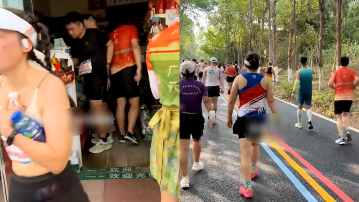 視頻畫面顯示,在7.5公里處,補水站已經沒有工作人員,也沒有水,不少參賽者都跑去路邊的商店裡買水喝。