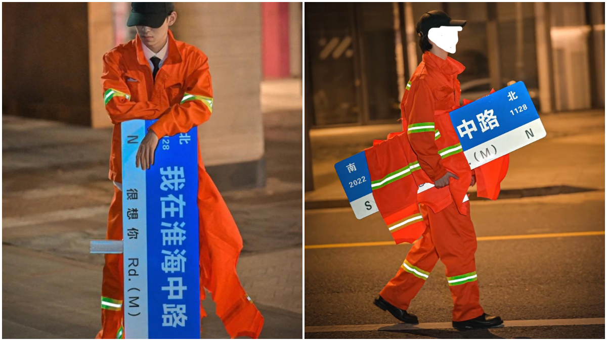 網傳視頻顯示,10月28日深夜,一名年輕男子身穿制服扮成環衛工人,抱著自製的路牌上街。路牌上寫「我在淮海中路」、「很想你」。但他在街上行走時,故意用衣服遮住其它的字,只露出「中路」兩個字,很容易讓人聯想起兩年前「白紙運動」時的「烏魯木齊中路」事件。