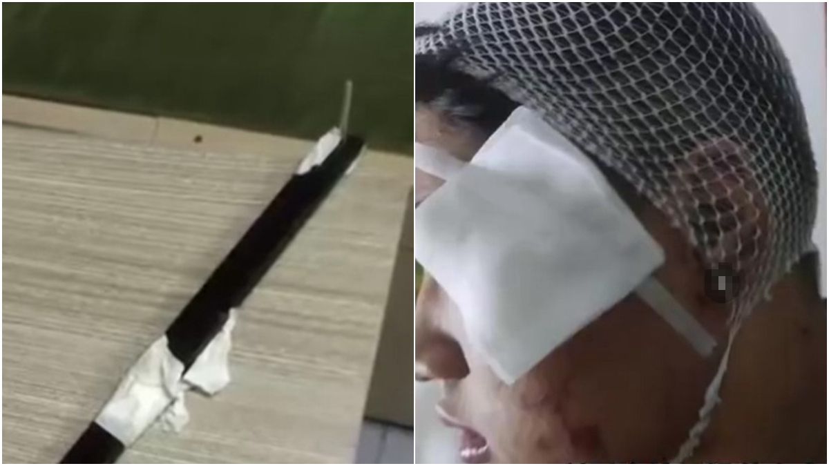 從家長提供的照片來看,作案的棍子長約半米,其中一端有一個沒有尖的釘子。受傷的孩子頭上纏著繃帶,臉上多處傷口清晰可見。