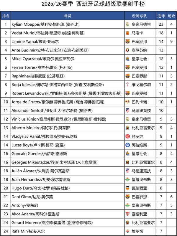西甲射手榜(前25位)