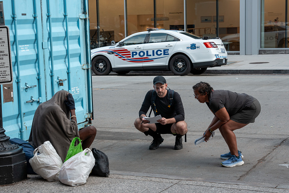 無家可歸者援助人員正在與一位居住在華盛頓特區馬丁路德金公共圖書館附近的男子商討是否在2025年8月14日離開該地區。(Andrew Leydeni/Getty Images)
