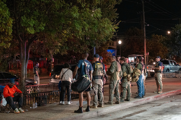 2025年8月14日,美國聯邦調查局(FBI)、菸酒槍砲及爆炸物管理局(ATF)和美國公園警察(U.S. Park Police)的警員在華盛頓特區河濱露台(River Terrace)街區為一名疑似出現合成大麻副作用的女子提供援助。(Andrew Leyden/Getty Images)