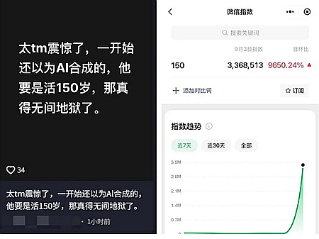 針對習近平所謂「活到150歲」的話題,有網友反饋,九三大閱兵當天,「150」這個數字在微信搜尋量異常飆升,整體數值比起上個月3日暴漲9650.24%,短短一天時間,突破336萬次的搜索量。
