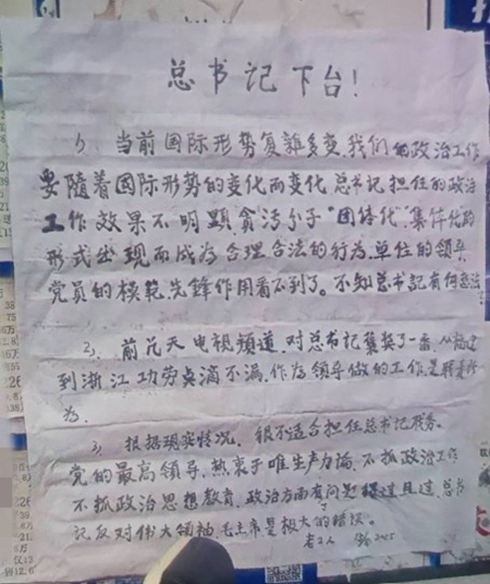 8月31日海外多個自媒體平台傳出,在北京一處公告欄裡,驚現有人張貼的大字報,題目是《總書記下台》,當中提出了三個具體的要求,並且直指中共黨魁習近平「很不適合擔任總書記職務」等等。