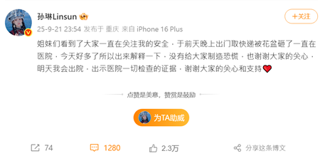 9月21日,孫琳表示,「姐妹們,看到了大家一直在關注我的安全,於前天晚上出門取快遞被花盆砸了一直在醫院,今天好多了,所以出來解釋一下,沒有給大家製造恐慌,也謝謝大家的關心,明天我會出院,出示醫院一切檢查的證據,謝謝大家的關心和支持。」