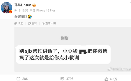 9月19日,孫琳說,「好害怕哦。」帖文配圖的內容顯示她受到警告了。