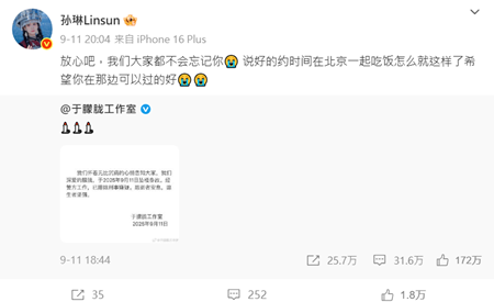 9月11日,孫琳在其新浪微博發文並轉發了「于朦朧工作室」的聲明,她表示,「放心吧,我們大家都不會忘記你,說好的約時間在北京一起吃飯,怎麼就這樣了,希望你在那邊可以過的好。」