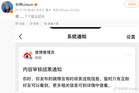 9月17日,孫琳表示,「好嚇人嘛!在威脅誰嘛!安全的第一天。 」但她的配圖已無法看到相關內容。