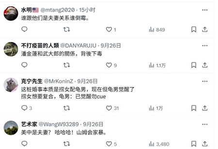 李強重提的所謂美中「夫妻關係」,引發網民嘲諷,在海外X平台上有網民說,「誰跟他們是夫妻關係誰倒楣。」「潘金蓮和武大郎的關係,背後下毒。」「真扯,前腳剛辦完閱兵,三國軸心已經鑄成。現在說穩定中美關係?」「什麼噁心人的比喻,誰跟你流氓做夫妻。」