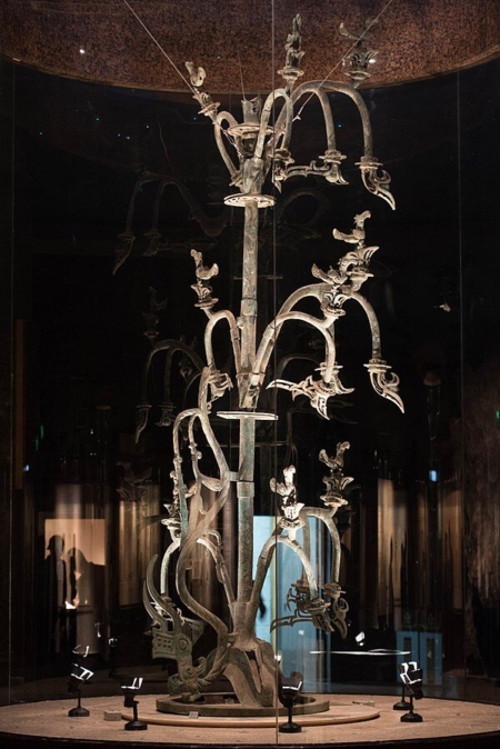 例如,三星堆的青銅神樹,其造型與《山海經》裡記載的扶桑樹極為相似。這棵高達3.96米的青銅神樹,一共分為三層,每一層都有三根樹枝,一共是九根樹枝,每個樹枝上都站著一隻神鳥。九個樹枝一共有九隻神鳥。樹幹上還有一條倒垂的龍,好像從天而降一般。