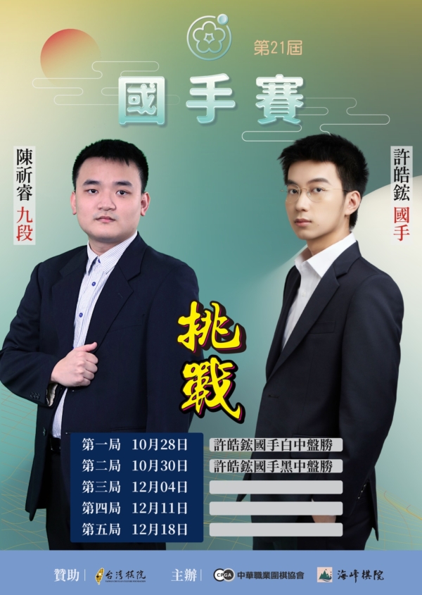 【新唐人北京時間2025年10月31日訊】由台灣棋院文化基金會贊助的職業棋壇年度盛事「第21屆國手挑戰賽5番勝負」今(30)日於海峰棋院進行第2局交鋒。衛冕者許皓鋐國手再次戰勝挑戰者陳祈睿九段,以中盤勝結束對局,將總比數拉開至2:0,距離「國手七連霸」僅一步之遙。