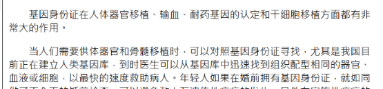 令人細思之極恐的是文章中的一段話,「當人們需要供體器官和骨髓移植時,可以對照基因身分證尋找,尤其是我國目前正在建立人類基因庫,到時醫生可以從基因庫中迅速找到組織配型相同的器官、血液或細胞,以最快的速度救治病人。」