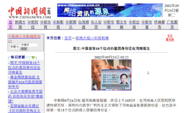 2002年9月24日,官媒中新網上的《中國首張18個位點的基因身分證在河南誕生》文章。(網頁截圖)