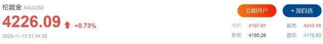 星期四(11月13日),黃金價格繼續維持走高趨勢。倫敦現貨黃金的價格在早間以4197.81美元/盎司開盤後,呈現居高震蕩的格局,盤中最高衝到4240美元/盎司,最低降至4180美元/盎司。截至倫敦時間下午2時30分許(北京時間晚9點半),倫敦金價報4226.09美元/盎司。