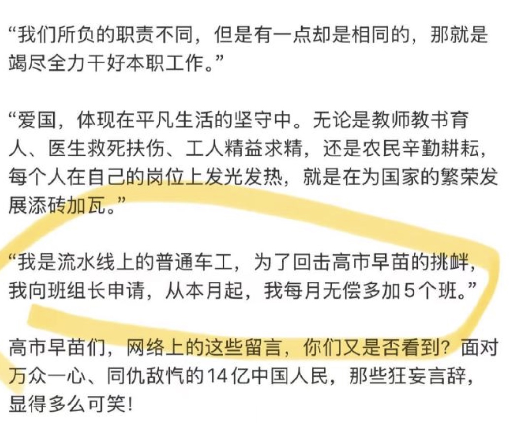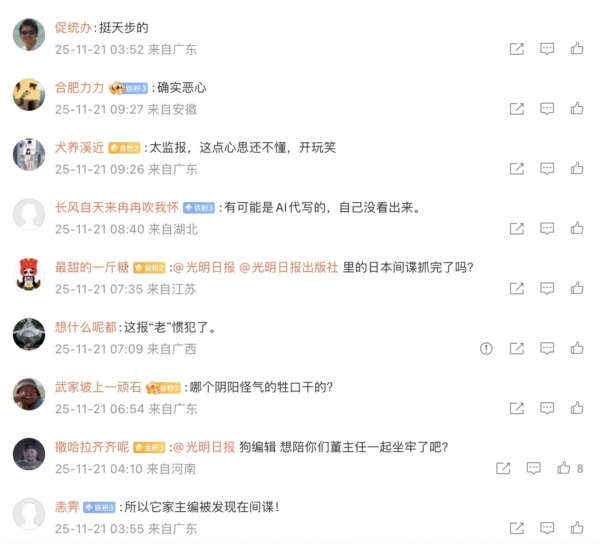 11月21日,《光明日報》頭版刊發副總編輯陳品高署名時評《#高市早苗們且記住#》,稱中國民眾都行動起來「愛國」,回擊日本「挑釁」,其中一段引用據稱是普通工人的發聲:「我是流水線的普通車工,我向班長申請,從本月起,我每月無償多加5個班」。
