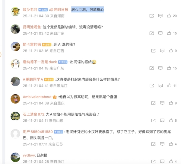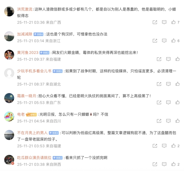 「可以判斷為低級紅高級黑,整篇文章邏輯狗屁不通,為了這盤醋而包了一盤帶老鼠屎的餃子」「這明顯是高級黑。建議直接判刑」「高級黑,別以為大家看出不來」「居心叵測,包藏禍心」「寫這些稿子的人是高級黑還是思維仍然停留在上個世紀?」