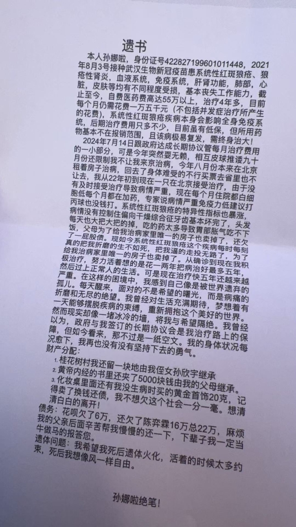 12月5日,網上新冠(中共病毒)疫苗受害者維權群組傳出一份遺書。立遺囑的人名叫孫娜啦,不到30周歲。遺書中稱,自己2021年注射武漢生物新冠疫苗後罹患系統性紅斑狼瘡,身體多器官受損,治療已花費超過55萬元人民幣,目前每個月需要治療費用1.5萬元。