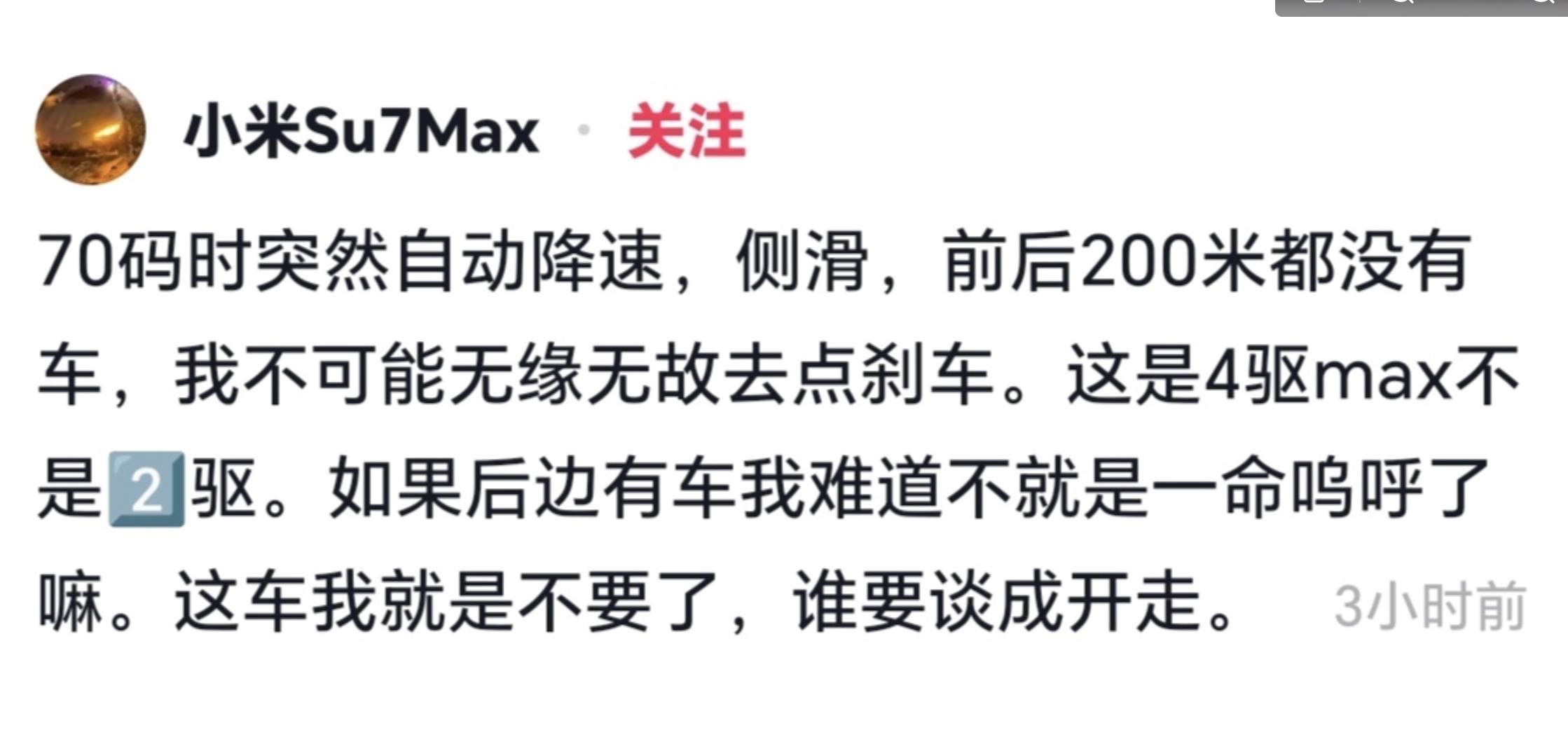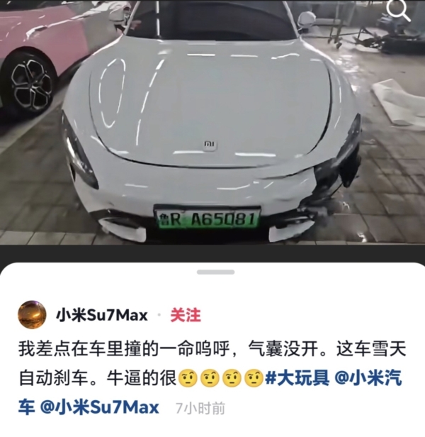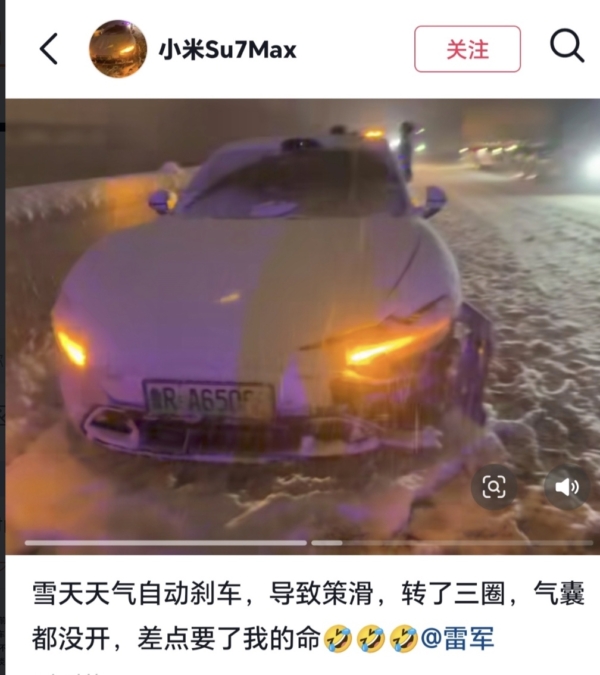 該車主稱,自己開的是一輛四驅版小米SU7 Max,正值下大雪,事故發生時,車輛正以約70公里/小時的速度行駛,且前後200米內無其它車輛。車輛突然自動剎車,致使車身嚴重失控側滑,旋轉三圈後發生碰撞。碰撞中,車輛的安全氣囊並未彈出。