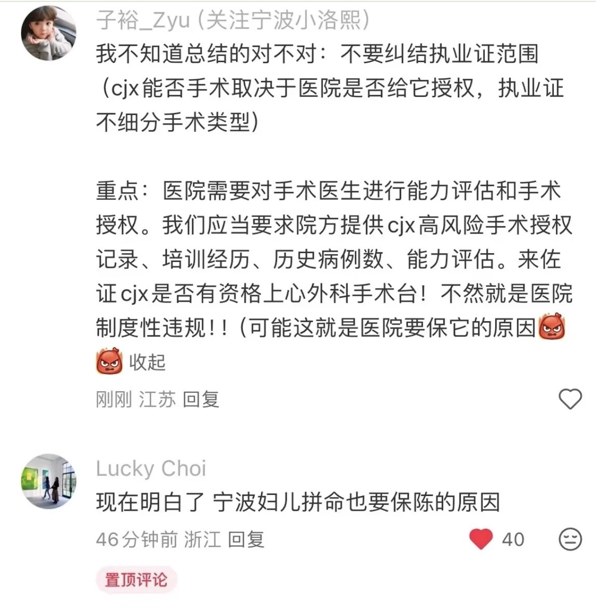 還有一個網友說,「醫院需要對手術醫生進行能力評估和手術授權,我們應當要求院方提供cjx高風險手術授權記錄、培訓經歷、歷史病例數、能力評估,來佐證cjx是否有資格上心外科手術台,不然就是醫院制度性違規」,該網友還說,可能這就是醫院要保他的原因」。