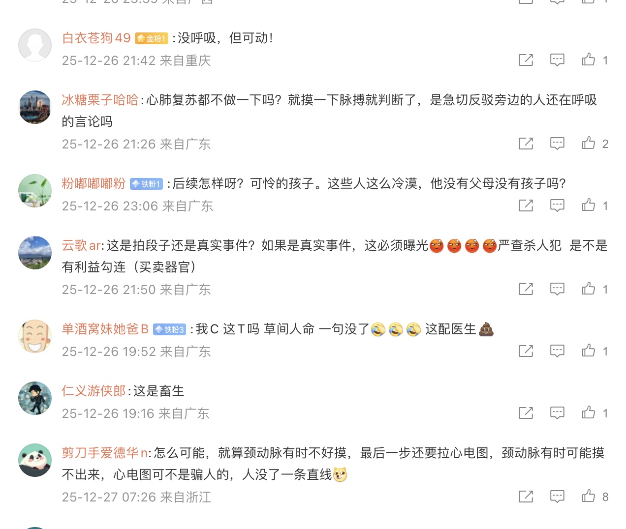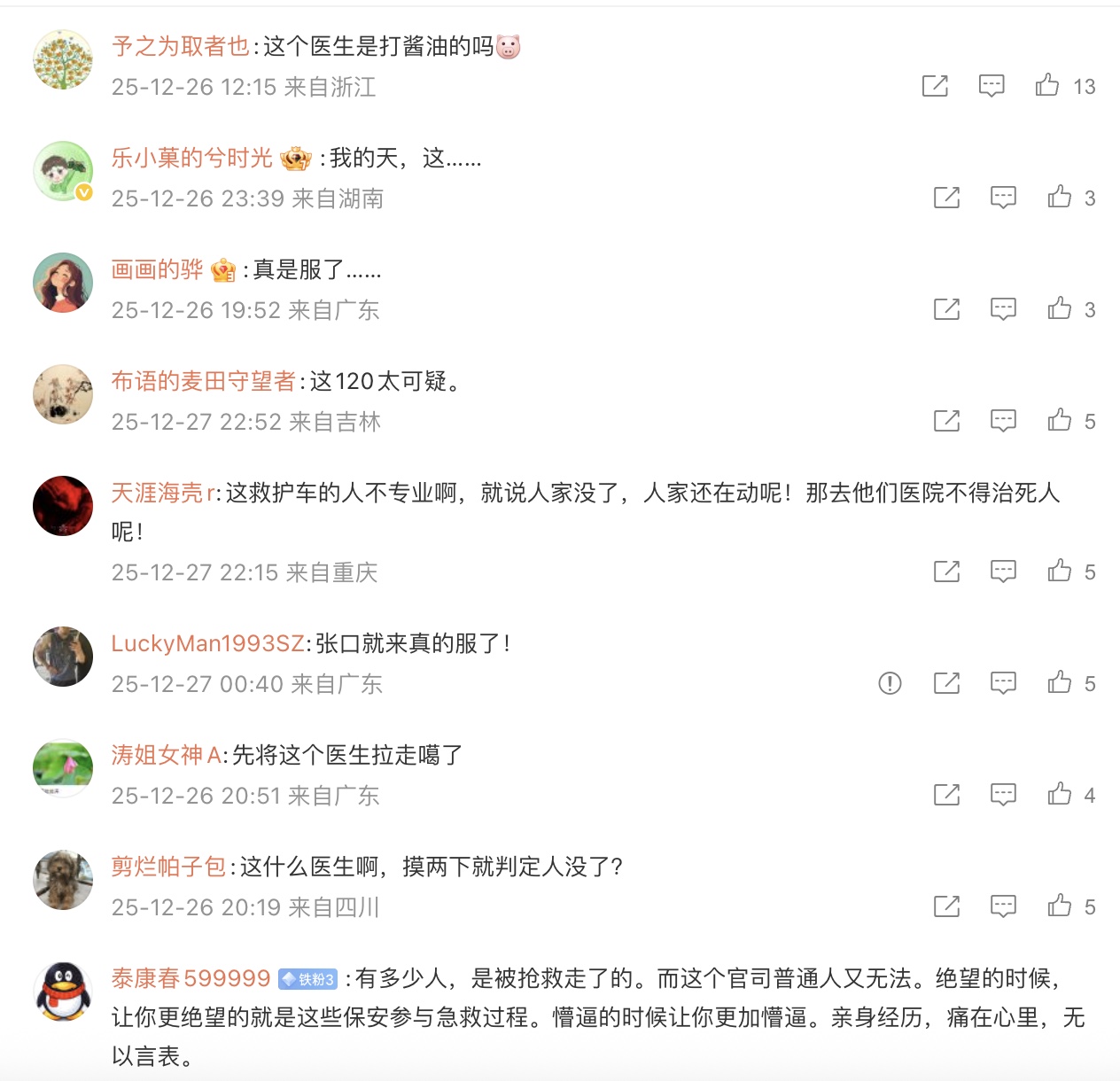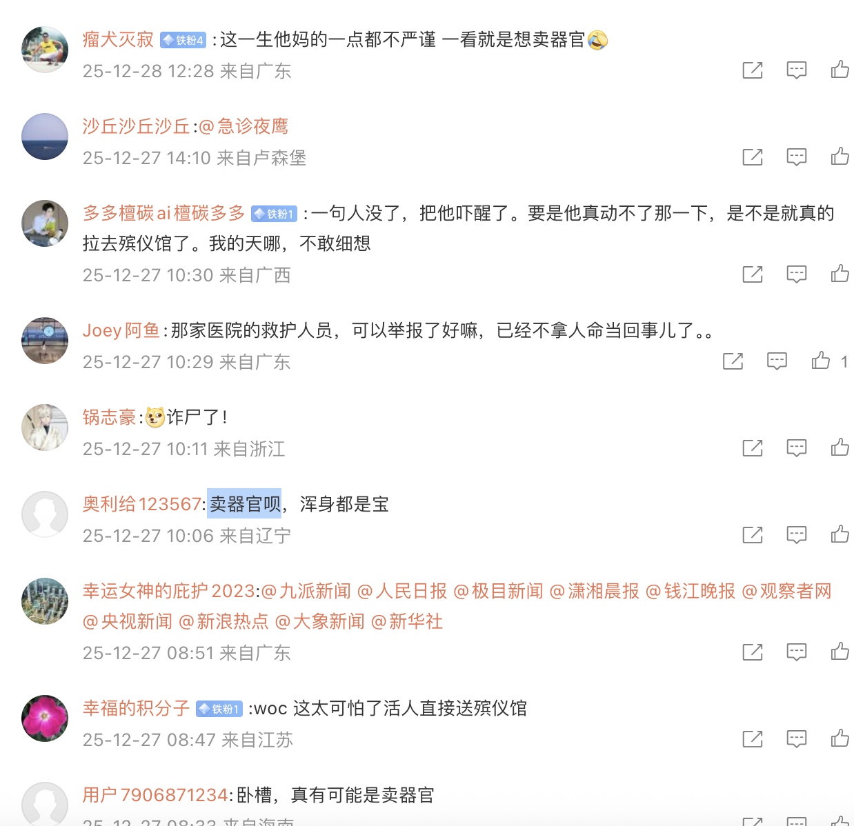 還有網友說,「差一點拉去,器官是不是熱乎的。張口就沒有了。」「有可能乘機賣人體器官。」「是不是搬上車的話 就要打鎮定劑了……根本沒有醒來的可能,越想越恐怖。」「人家自己都抬頭了,說別人死了?太可怕了吧!」「這120太可疑。」「恐怖的社會 越來越魔幻了。」