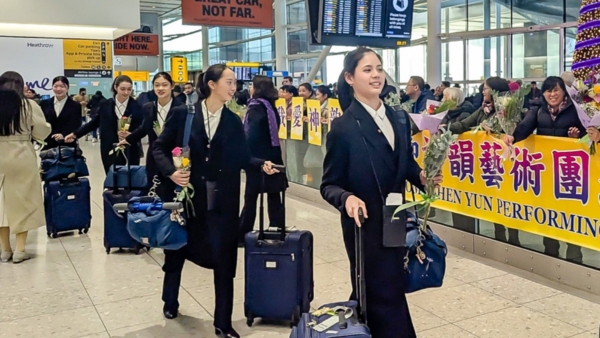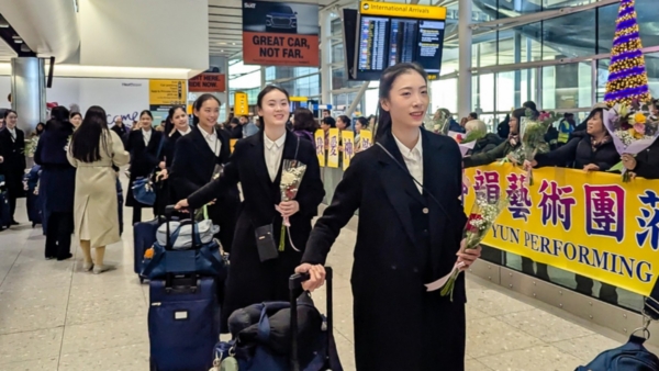 神韻藝術家一走進希思羅機場大廳,就有現場粉絲熱情歡呼「歡迎神韻,歡迎神韻」,並為藝術家獻上花束。今年是神韻藝術團成立20周年,藝術家也很期待與英國觀眾分享全新的節目。