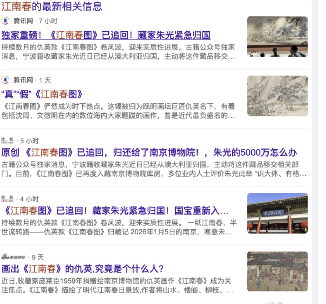 1月5日,據稱在「業內頗有知名度」的微信公眾號「古籍」發文《獨家重磅!〈江南春圖〉已追回!藏家朱光緊急歸國》。文章稱,「寧波藉收藏家朱光近日從澳大利亞歸國,主動將這件藏品移交給相關部門。目前,《江南春圖》已再度入藏南京博物院庫房」。
