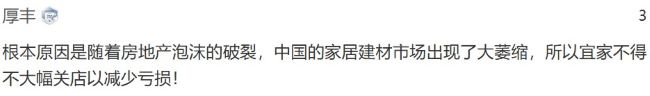 在宜家的7家門店即將關閉的消息傳出後,中國網友紛紛在網絡上發帖表示惋惜:「可惜,這麼好的商場居然要關了!」「我挺意外的,這麼大的商場說關就關,是不是哪裡沒搞對?」「以前裝修都是去宜家淘點小東西,現在真有點不方便了。」