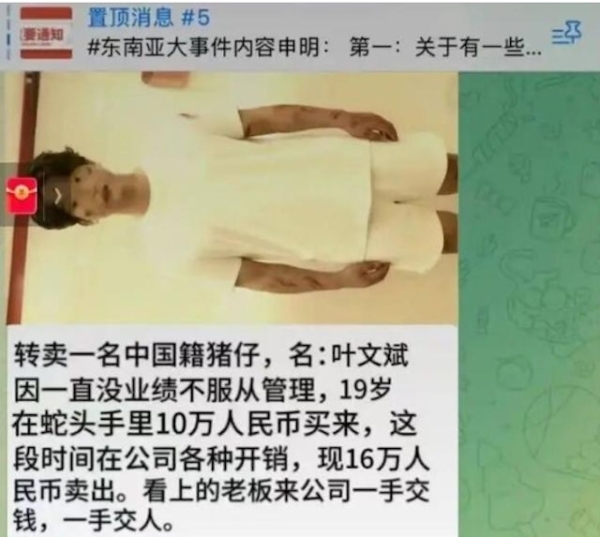 她說,去年10月,反詐志願者轉發的某社交軟件的群消息顯示,葉文斌正在被一個電詐公司轉賣。該公司稱他為「中國籍豬仔」,「一直沒業績不服從管理」。轉賣廣告配發的照片顯示,葉文斌身上傷痕纍纍。