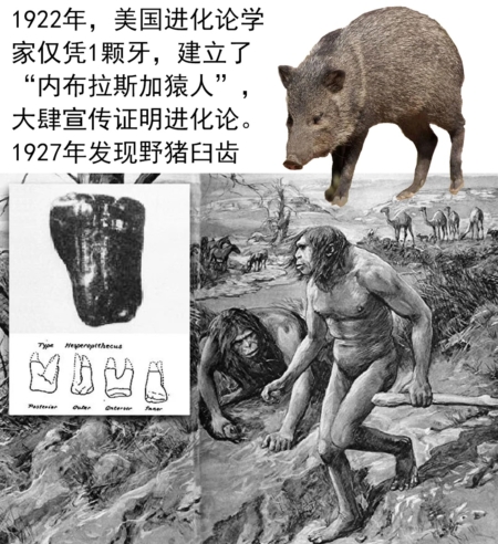 大家想想,如果沒有較為完整的古野豬化石出土,或者發現者也像那些權威那樣,大家群起圓謊掩蓋的話,就不能還原美國「猿人」為野豬的事實。那樣,進化假貨,很可能會像爪哇「猿人」那樣死賴招搖,發明出一個進化旁枝,豐富「進化」思想。