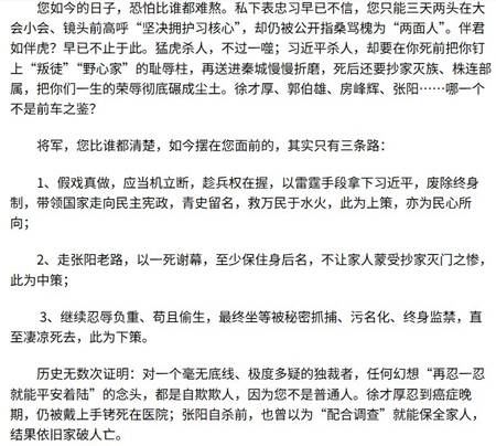 實際上,早在去年底,網上就有人寫了一封致張又俠的公開信,呼籲張又俠順應民意,發動一場針對習近平的軍事政變,否則恐怕難以善終。