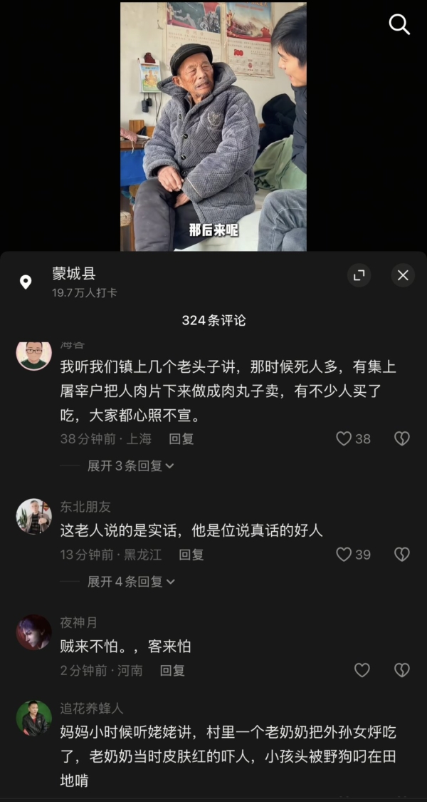 一名網民在視頻後留言說,聼家鄉的老人講,當時有屠戶把死人肉做成肉丸子,就在大集上賣,大家心照不宣,買回家吃。還有人說,老家有一個老奶奶吃了自己的外孫女。