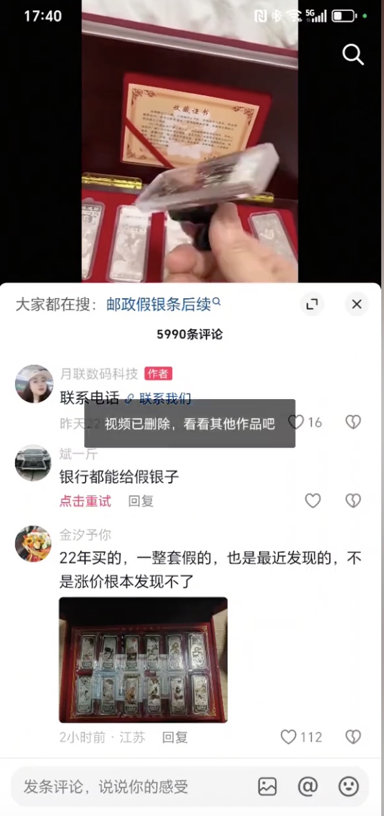 據網傳視頻,該女子介紹,2017年,她在郵政銀行定期存款,郵政銀行贈送給她一套珍藏版的雞年銀條,她從沒想過是假的,一直珍藏著。最近,因為銀價上漲,她拿出來準備賣掉,結果去檢測發現,這些銀條不僅克數有假(標示50克,其實36克),而且,含銀量很低,基本成分是鐵。