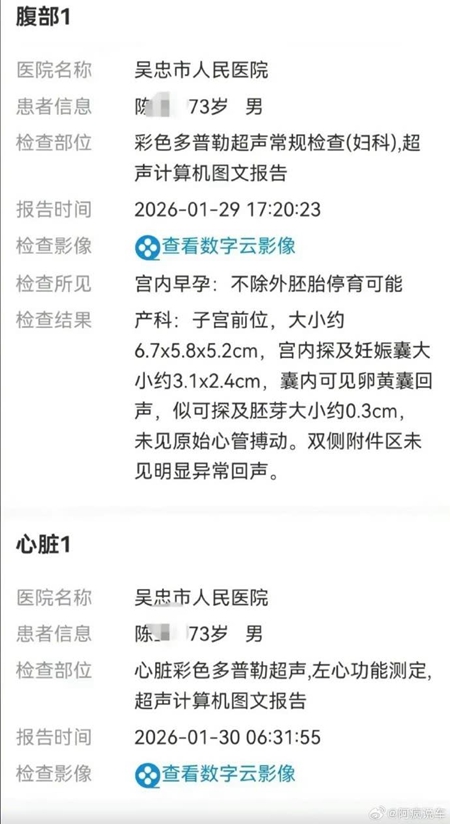 中國寧夏有位網民在1月30日發文稱,自己同事的73歲爸爸1月22日因心臟不舒服,前往當地醫院就診,完成了相關檢查後,1月29日醫院傳送了「電子檢查報告」,結果顯示「宮內早孕,不排除胚胎停育可能」。