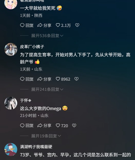 上述事件引發中國網民一片嘲諷,「為了提高生育率,開始對男人下手了,先從大爺開始,高齡產爺。」「73歲、爺爺、宮內、早孕,這幾個詞是怎麼聯繫到一起的。」「我還以為男人終於可以懷孕了。」「孫子在學校:老師,請個假,我爺懷孕了。」