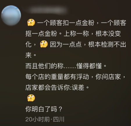 有網友稱:「一個顧客扣一點金粉,一個顧客摳一點金粉。上稱一稱,根本沒變化, 因為一點點,根本檢測不出來。而且他們的稱……懂得都懂。每個店的重量都有浮動,你問店家,店家都會告訴你:誤差。你明白了嗎?」