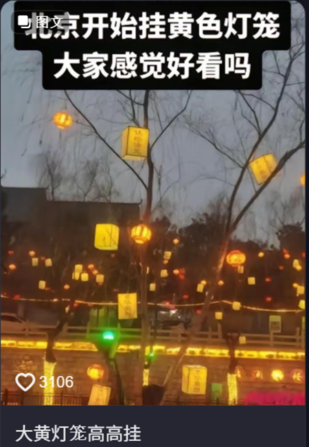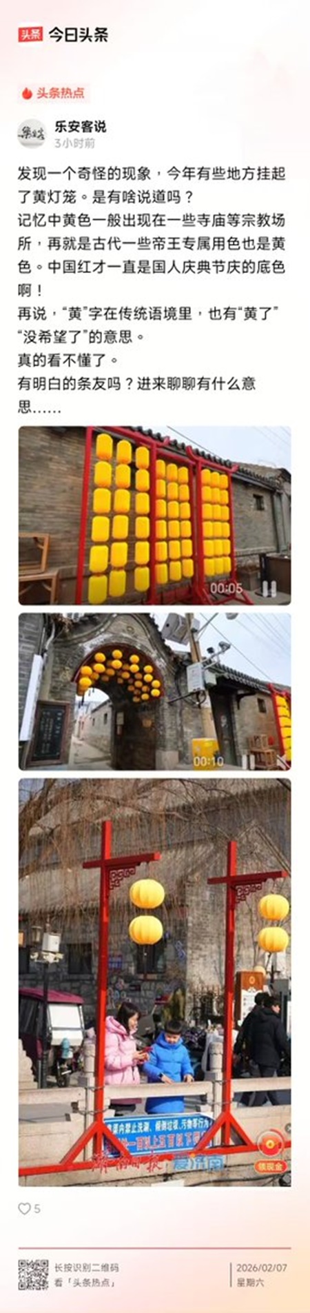 大陸極目新聞報導,2月5日,有商戶發視頻稱,河北涿州大街小巷掛上了黃色燈籠,不知有啥寓意。評論區有2萬多人參與討論,有人覺得黃燈籠寓意「富貴吉祥」,也有人稱有點怪異,還有人稱黃燈籠用作祭祀。因為負面評論過多,6日下午,該短視頻作者關閉了評論。