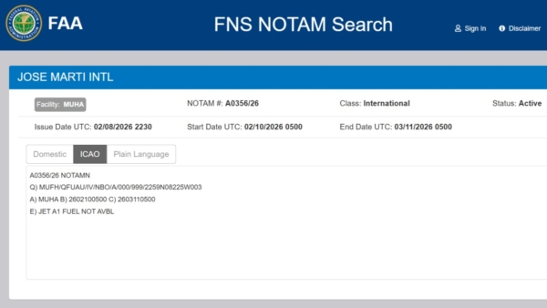 古巴的航行通告表明,這不再是古巴政府的口頭警告。該通告是全球航空警報系統的一部分,用於向機組人員和航空公司通報相關的營運狀況。