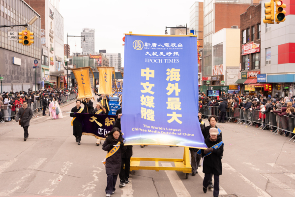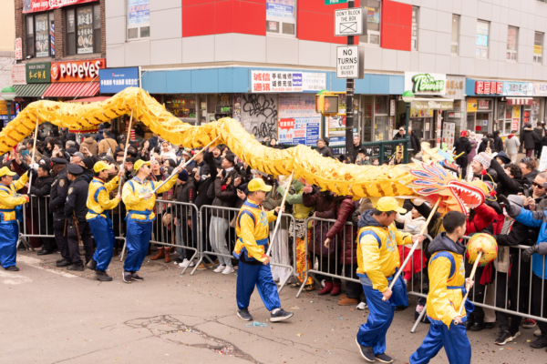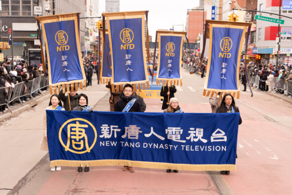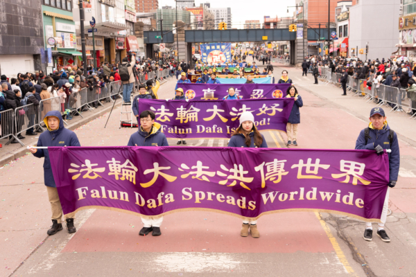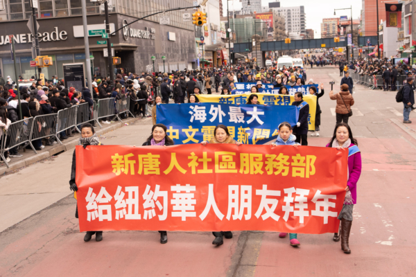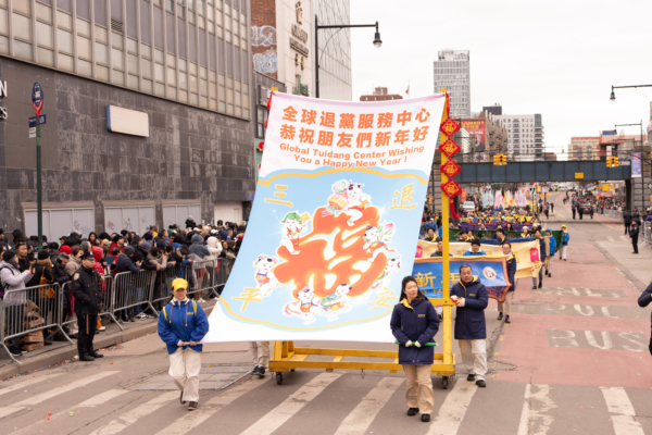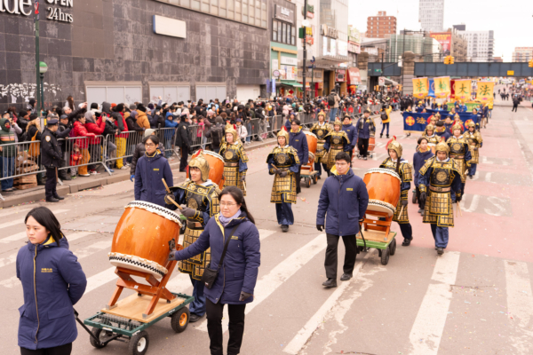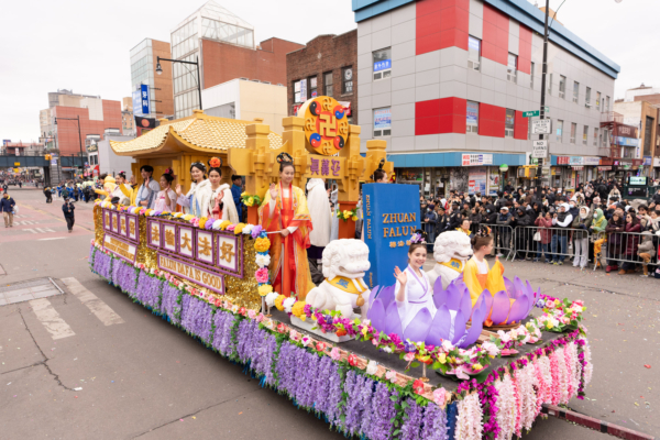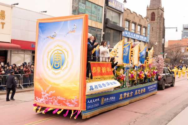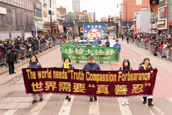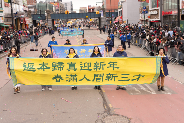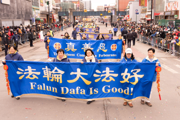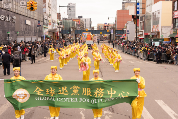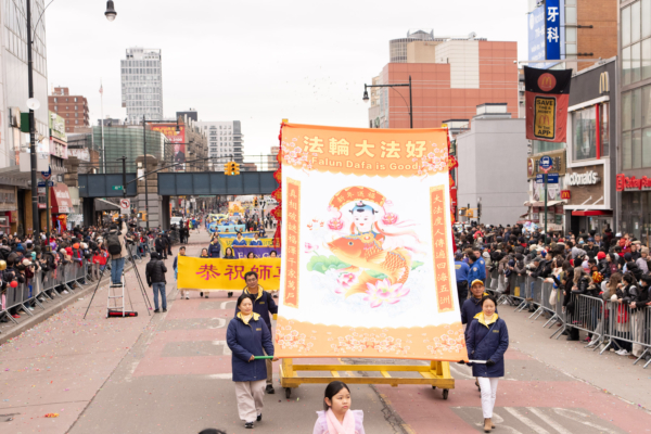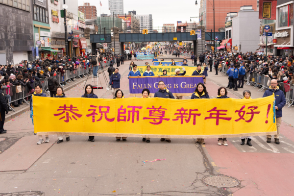 法輪功學員也參加了這個法拉盛一年一度的中國新年大遊行活動,包括天國樂團、大紀元新唐人媒體集團及全球退黨服務中心等,聲勢浩大,壯觀亮眼,深受歡迎,沿路圍觀民眾紛紛用手機拍照、錄像。