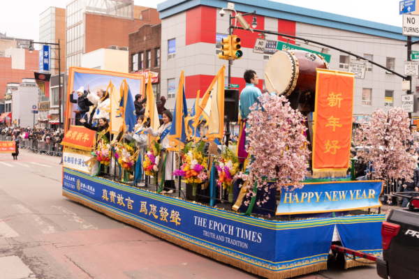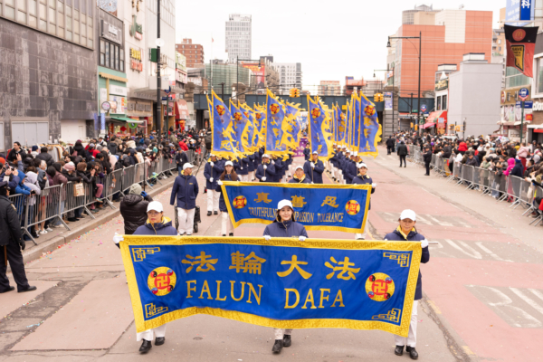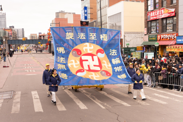 法輪功學員也參加了紐約市這個最大華人聚居地——法拉盛一年一度的中國新年大遊行活動。第一方陣天國樂團的隊員,氣勢如虹、威風凜凜,奏響《法輪大法好》《神聖的歌》《法鼓法號震十方》《法輪聖王》等樂曲。