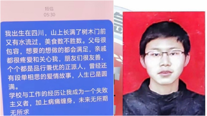 其家人提供的手機短信顯示,該男子感到自己生活失敗,身體有疾病,並表示「對未來無所求」。其家人也在網絡發出尋人啟示,希望知情人能提供線索。