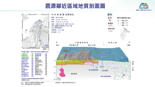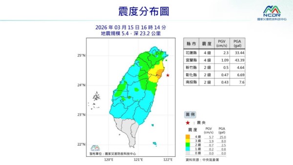 【新唐人北京時間2026年03月15日訊】根據中央氣象署最新資訊,今天(3月15日)下午4時14分發生里氏規模5.4地震,地震深度23.2公里,震央位於宜蘭縣政府南南東方49.6公里(位於台灣東部海域),最大震度花蓮縣、宜蘭縣4級。