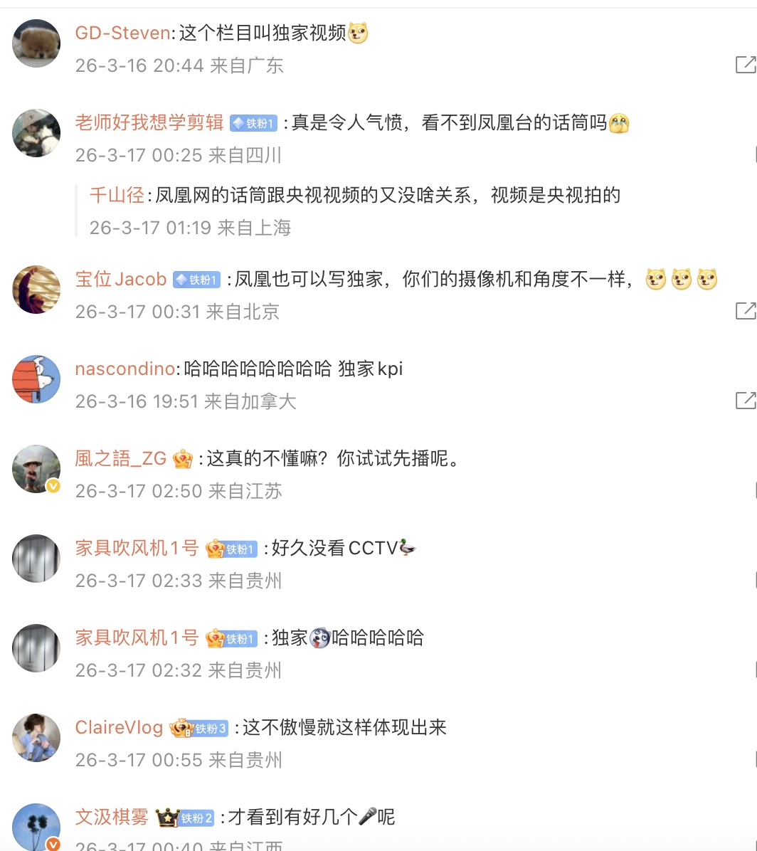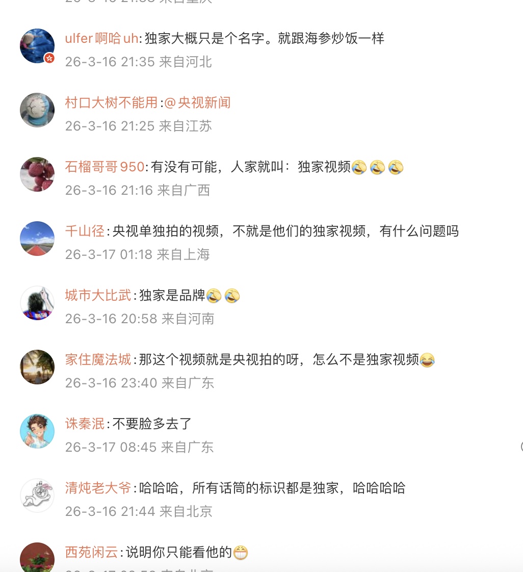 還有網友嘲諷:「這個欄目叫獨家視頻」「人家名字叫『獨家視頻』,跟那個『千禾O』添加醬油一樣,望周知」「獨家大概只是個名字。就跟海參炒飯一樣」。