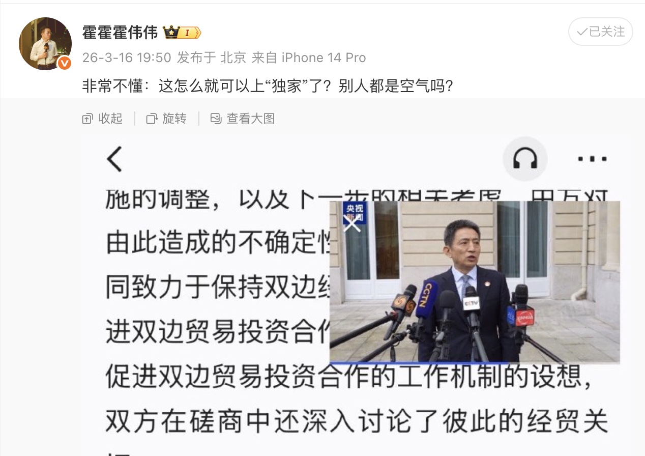 【新唐人北京時間2026年03月18日訊】2026年3月17日,中共央視播出一段關於中美商務談判的採訪記錄,並冠以「獨家視頻」標籤。然而,畫面中清晰可見多家媒體同時進行採訪,隨即引發網友質疑:「難道別家媒體都是空氣?」