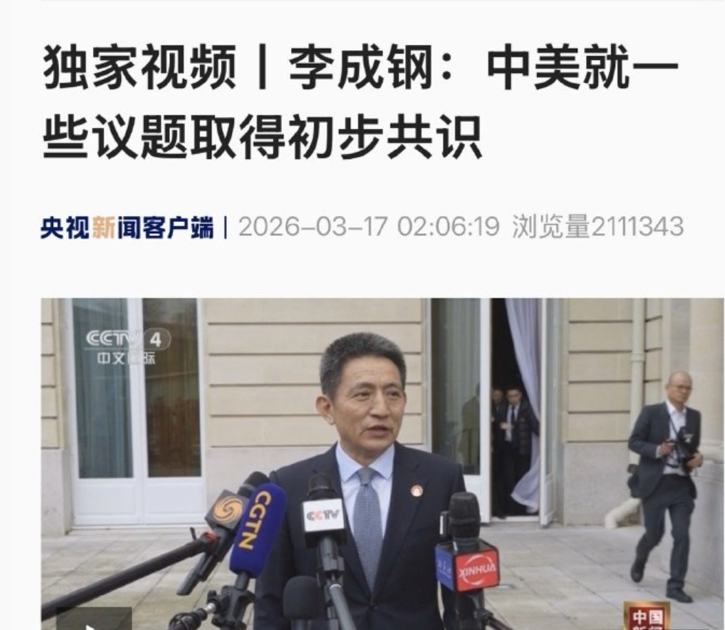 中共央視的報導題目為「獨家視頻《李成鋼:中美就一些議題取得初步共識》」。報導稱,當地時間3月15日至16日,中美雙方在法國巴黎舉行經貿磋商。中共商務部國際貿易談判代表兼副部長李成鋼表示,過去一天半,雙方團隊就一些議題取得初步共識,下一步雙方將繼續磋商。