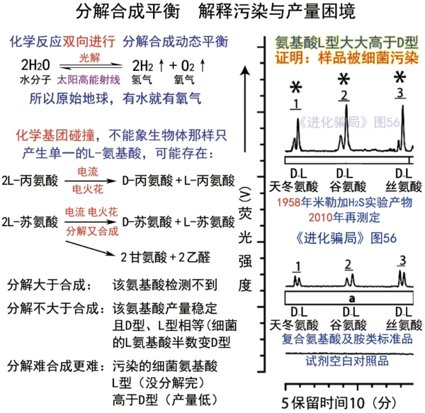 (1)這樣的「原始大氣」條件下,化學進化永遠不能實現,因為分解大於合成的賴氨酸、組氨酸、精氨酸永遠造不出來。除非換反應條件。