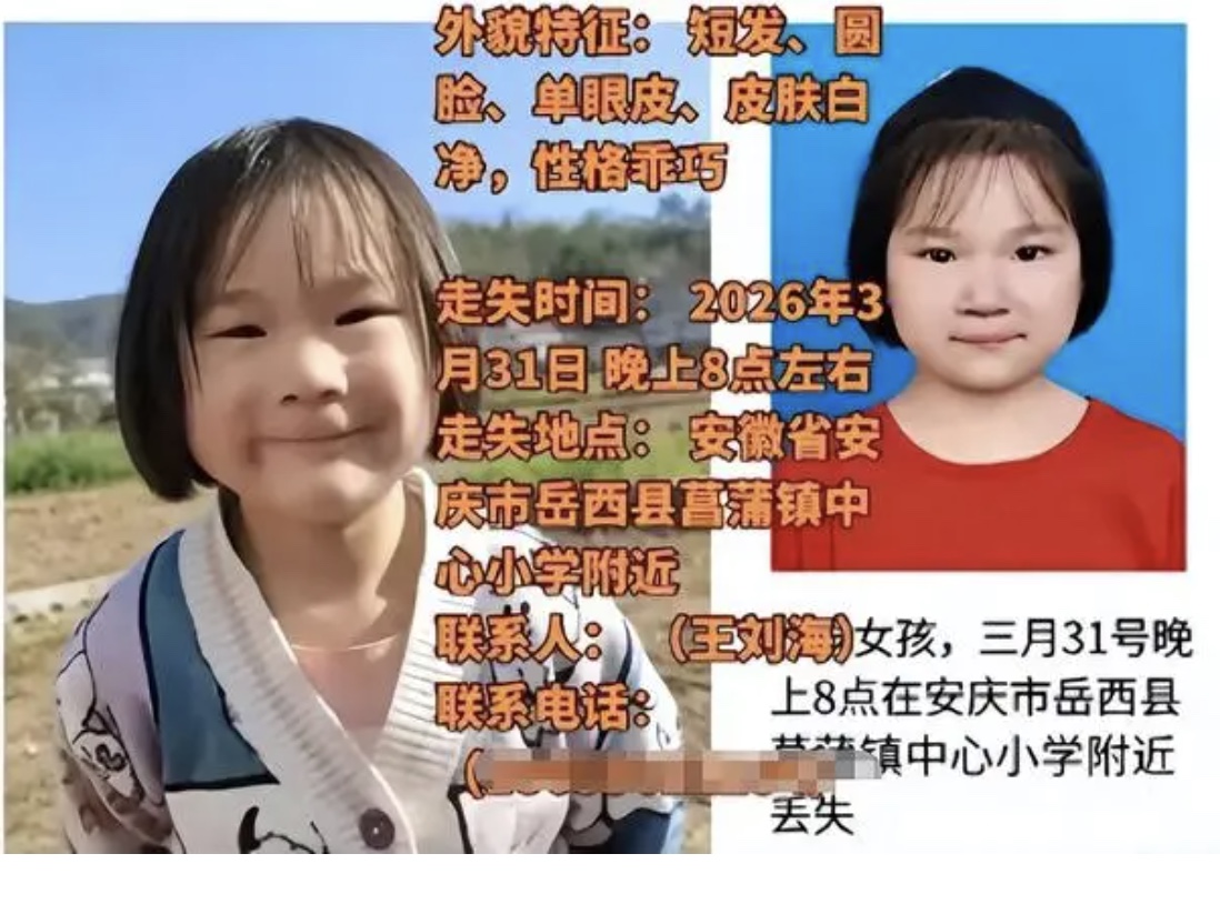 據大陸媒體報導,事發時間為3月31日晚8點左右,孩子走失地點在安徽省安慶市岳西縣菖蒲鎮中心小學對面。