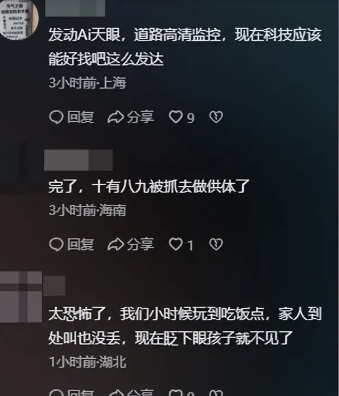 還有網友說,「滿天攝像頭,小孩丟了找不到」、「攝像頭啥都能拍到,就是孩子失蹤拍不到」。