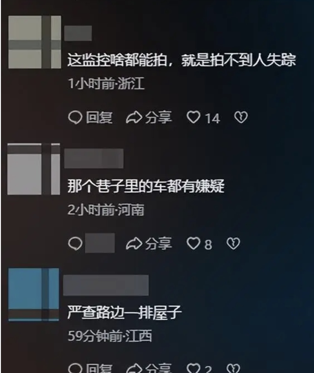 網友議論,「好奇怪,孩子憑空消失了?」「這不是什麼荒郊野嶺,這是鎮中心,對面就是小學,附近有街道、有住戶、有行人,充滿疑點」、「根據現場兩個監控的畫面顯示,孩子當時並沒有走出外圍區域。她沒有跑到街上去,如果她上了街,街道上的監控大概率會拍到她的身影,但截至目前,沒有任何監控捕捉到她離開這片區域的畫面,那問題來了:一個6歲的孩子,在一條長約10米的小路上消失,又沒有走出外圍區域,她能在哪?」